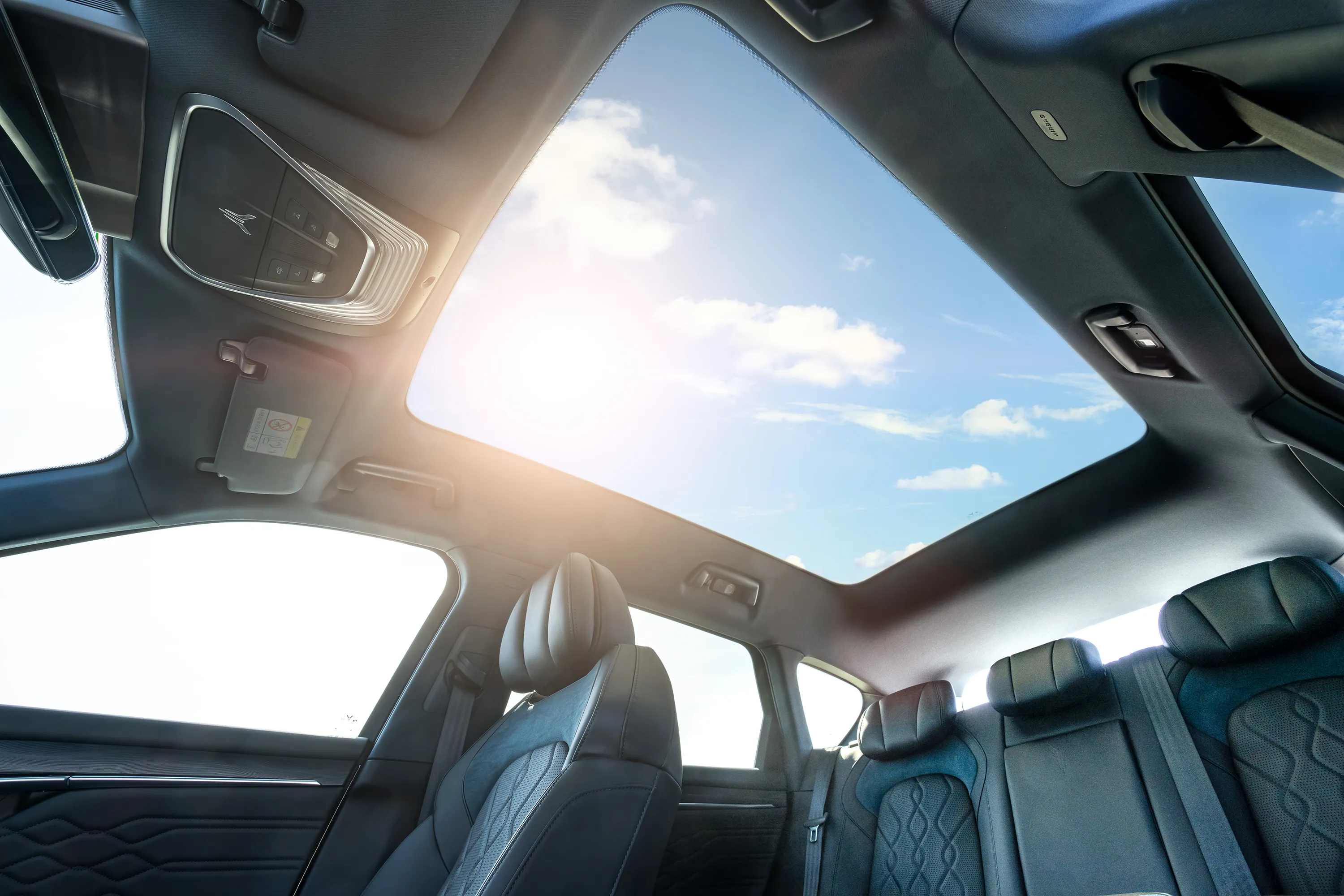 Det romslige og dimbare panoramataket skaper en følelse av åpenhet og lys i hele kupéen. Det gir en fantastisk utsikt over omgivelsene og gir en unik opplevelse av å kjøre under åpen himmel.